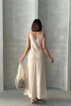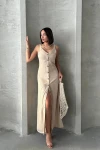 Bej Askılı Yırtmaç Detaylı Maxi Boy Dokuma Gömlek Elbise