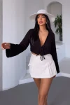 Bej Bağlamalı Crop Muslin Dokuma Bluz