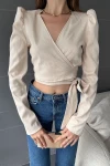Bej Kruvaze Yaka Beli Kuşaklı Crop Bluz