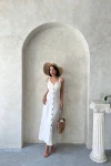 Beyaz Askılı Yırtmaç Detaylı Maxi Boy Dokuma Gömlek Elbise