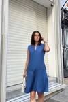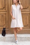 Beyaz Keten Yakası Yırtmaçlı Cepli A Kesim Salaş Elbise