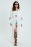 Beyaz Sırtı Ve Kolları Nakışlı Kemer Bağlamalı Uzun Kimono Ceket
