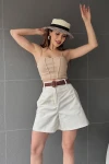 Ekru Beli Kemerli Geniş Paçalı Mom Şort