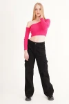Fuşya Tek Omuz Dekolteli Uzun Kol Kaşkorse Bluz