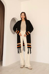 Gri Püsküllü Renk Bloklu Uzun Triko Hırka