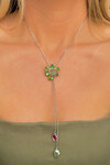 - Zarif tasarımıyla dikkat çeken Idyllia Kolye, yeşil çiçek detaylarıyla feminenliğinizi ön plana çıkarır.; - Uzun yapısı sayesinde boynunuza rahatça oturur ve şık bir görünüm sağlar.; - Kadın ve kız kullanıcılar için ideal olan bu kolye, her türlü kıyafetle uyum içinde kombinlenebilir.; - Paslanmaz çelik materyali ile dayanıklılık ve uzun ömürlü kullanım sunar.; - Göz alıcı zirkon taşlarla süslenmiş olup, ışıltınızı her ortamda hissettirir.; - Türkiye'de üretilen bu ürün, yerel kaynaklı malzemelerle kalite standartlarına uygun olarak hazırlanmıştır.; - Bakım talimatlarına uyarak kolayca temizlenebilir; nemli bir bezle silerek parlaklığını koruyabilirsiniz.