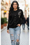 Kahverengi Düğmeli Çiçek Nakışlı Kışlık Triko Hırka BCVL-25T2364