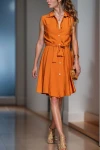Kiremit Kendinden Kemerli Çift Cep Kiloş Keten Gömlek Elbise
