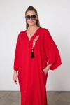 Kırmızı Nakış İşlemeli Maxi Boy Dokuma Viscon Elbise