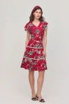 Kırmızı V Yaka Nervürlü Çiçek Desenli Yazlık Viscon Elbise