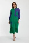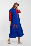 Saks Renk Bloklu Nakış İşlemeli Uzun Boy Dokuma Gömlek Elbise