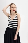 Siyah Beyaz İp Askılı Çizgili Triko Bluz