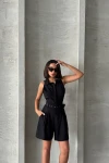 Siyah Kemerli Çift Cepli Yakalı Dokuma Tulum