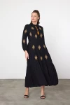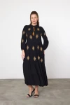 Siyah Nakış İşlemeli Maxi Boy Dokuma Viscon Elbise