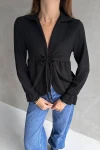 Siyah Yakalı Önü Bağcıklı Dokulu Bluz