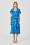Yeşil Mavi Desenli V Yaka Midi Boy Elbise