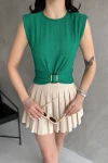 Yeşil Omuzu Vatkalı Beli Kemerli Bürümcük Bluz