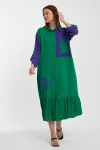Yeşil Renk Bloklu Nakış İşlemeli Uzun Boy Dokuma Gömlek Elbise