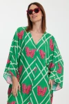 Yeşil V Yaka Çiçek Desenli Uzun Boy Dokuma Gömlek Elbise