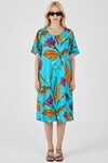 Yeşil Yaprak Desenli U Yaka Kısa Kollu Midi Boy Elbise
