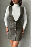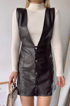 Bej Düğme Detaylı Suni Deri Jile Elbise