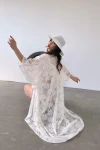 Beyaz Çicek Desenli Uzun Güpür Kimono