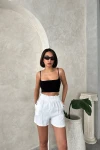 Beyaz Çift Cepli Beli Fırfırlı Önü Çimalı Keten Şort