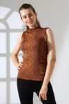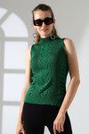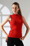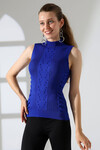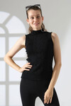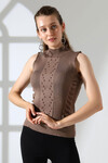 Beyaz Dik Yaka Kolsuz Motifli Triko Bluz