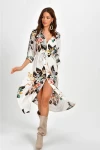 Çiçek desenli tasarım, canlı renkleri ve zarif detaylarıyla dikkat çeker. Bu desen, doğanın zarafetini yansıtarak feminen bir tarz oluşturur. Elbisenin maksi boyu, zarafeti ve şıklığı bir araya getirirken, uzun kolları da konfor ve kullanışlılık sunar.