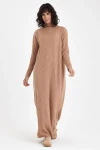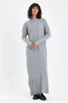 Ekru Dik Yaka Çizgi Desenli Maxi Boy Triko Elbise