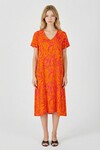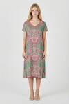 Fuşya Desenli V Yaka Kısa Kollu Midi Boy Elbise