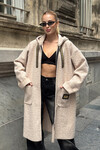 Gri Çift Cepli Kapüşonlu Uzun Kışlık Buklet Ceket