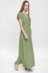 Elbisenin rengi haki olarak tasarlanmıştır, bu da ona sofistike ve zarif bir görünüm kazandırır. Hasır detaylar, omuzlarda ve göğüs dekoltesinde özel bir dokunuş sunar. Bu detaylar, elbisenin tasarımına benzersizlik katar ve sizi diğerlerinden farklı kılar.