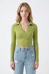 Hardal Polo Yaka Fitilli Yumuşak Dokulu Crop Bluz