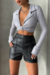 Kahverengi Dikiş Detaylı Suni Deri Mini Şort