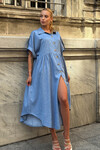 Koyu Mavi Kısa Kollu Düğme Detaylı Midi Boy Gömlek Elbise BCVL-254000