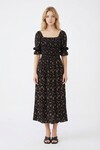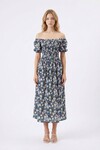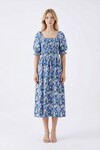 Lacivert Kare Yaka Beli Gipeli Çiçek Desenli Dokuma Yazlık Elbise