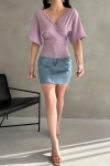 Lila V Yaka Sırtı Çapraz Bantlı Fitilli Bluz