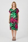 Mavi-Sarı Tropik Desenli V Yaka Rahat Kesim Elbise