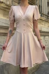 Pudra V Yaka Kolları Lastikli Düğme Detaylı Midi Boy Kloş Elbise