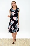 Siyah Çiçek Desenli Eteği Fırfır Kolsuz Dokuma Viskon Elbise