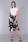 Siyah Çiçek Desenli Yırtmaçlı Volanlı Dokuma Viskon Etek
