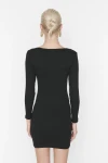 Siyah Göğüs Detaylı Uzun Kollu Dizüstü Kaşkorse Elbise