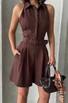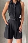 Siyah Kemerli Çift Cepli Yakalı Dokuma Tulum
