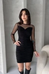 Siyah Tül Detaylı Drapeli Mini Elbise