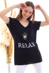 Siyah V Yaka Baskılı Omuzları Aksesuarlı Oversize Tişört